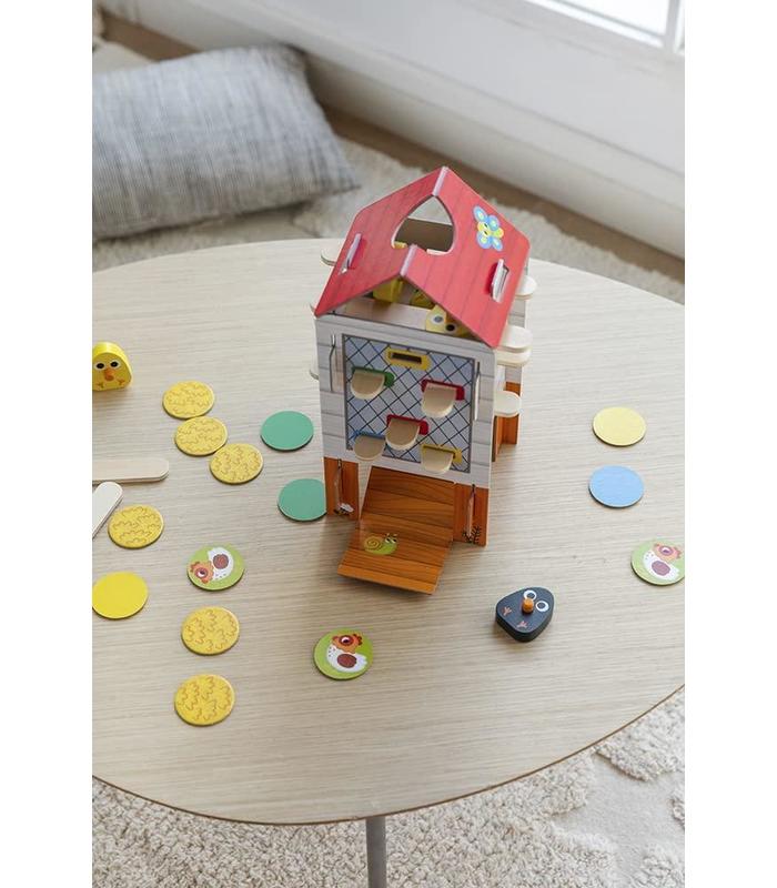 Contenido: 12 palos de madera/ 5 pollitos de madera/ 1 gallinero de cartón (en 5 partes)/ 18 fichas redondas