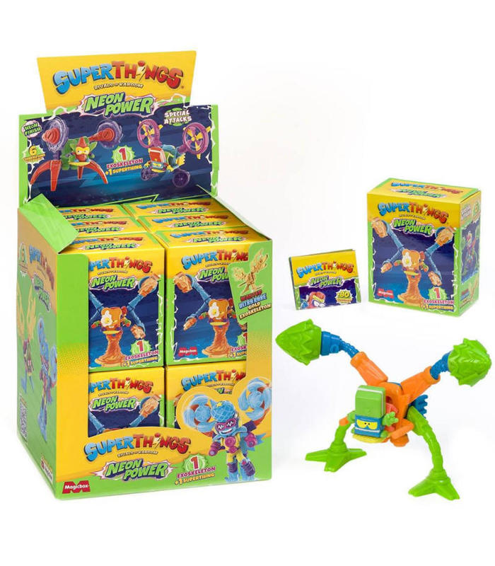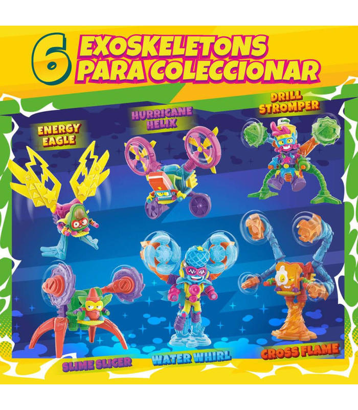 Por primera vez, ¡llegan los Exoskeletons! Estas armaduras con sus brazos móviles y ataques especiales ¡no tienen rival! Fruto de la tecnología del Profesor K, recibieron el poder neón de ColorFlash y ahora son aún más imparables. Héroes y villanos, SuperThings y Kazoom Kids, se han hecho con ellos, así que, la batalla será más loca que nunca. ¡Colecciona los 6 modelos y encuentra al Exoskeleton dorado!