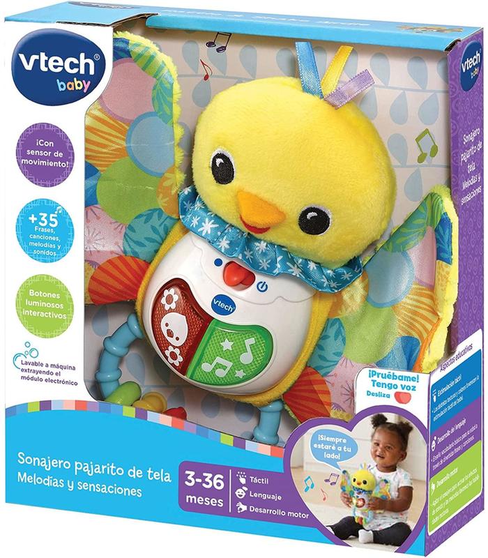 SIMPÁTICO Y COLORIDO pajarito con sus distintas texturas y colores favorece tanto la estimulación táctil como auditiva. Sus dos botones luminosos activan divertidas frases y canciones. ¡Agita el pajarito para activar su sensor de movimiento y escuchar divertidos sonidos!
