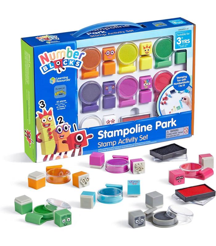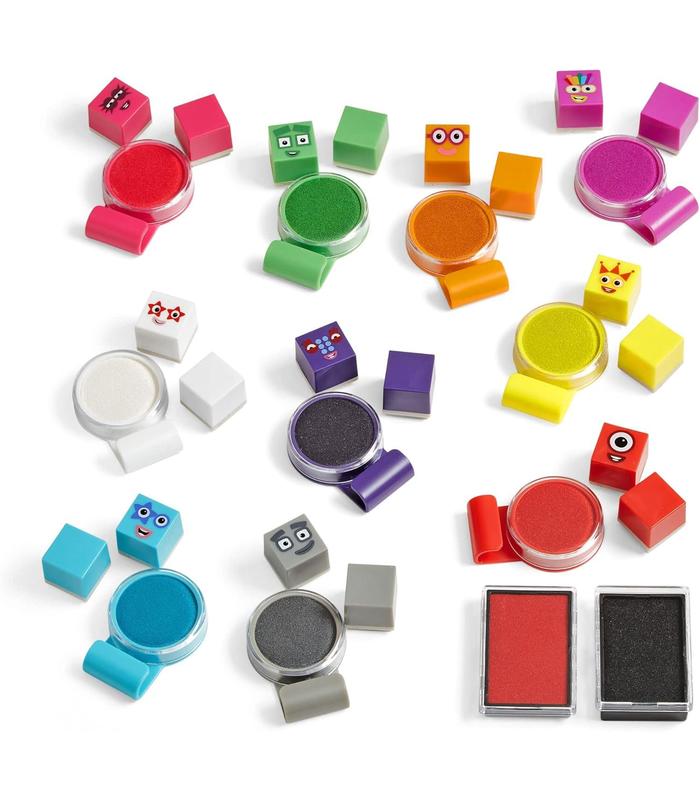 LOS PERSONAJES NUMBERBLOCKS DE LA SERIE DE TV: Recrea el episodio del Parque de Stampolines en casa o en el aula con este set de manualidades que cuenta con 20 sellos reutilizables y 12 tampones de tinta lavable de los colores de los Numberblocks.