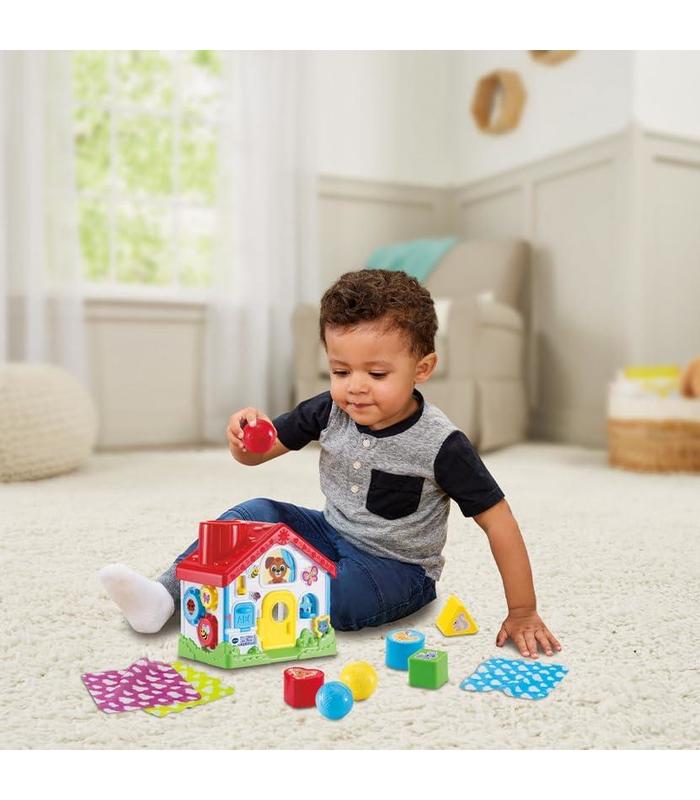 Chimenea: tira de uno de los 3 pañuelos o deja caer una de las 3 bolas. Tejado con encajable de formas: un hueco para cada figura.