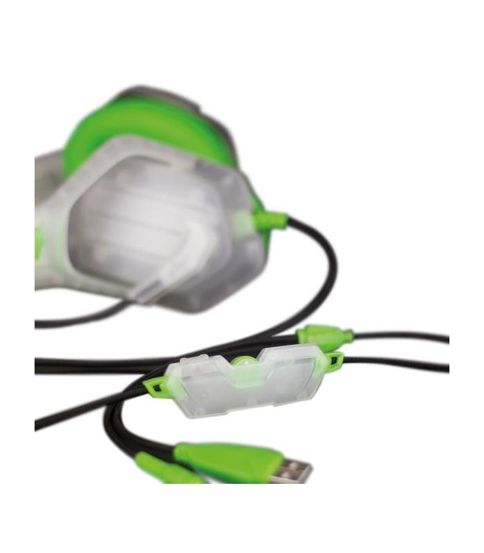 - Gracias a dos LED verdes a nivel de cada auricular y al material transparente, este auricular emite una luz muy fuerte e intensa.