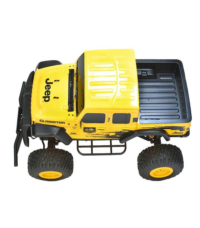 Incluye: 1 vehículo con función por radio control Jeep Gladiator de color amarillo y negro con función completa, 4WD, suspensión completa, estructura resistente y ruedas de goma, 1 control remoto para el vehículo con radio frecuencia 2,4GHz, 1 batería recargable de 7,4V para el vehículo y 1 cable USB de carga para la batería.