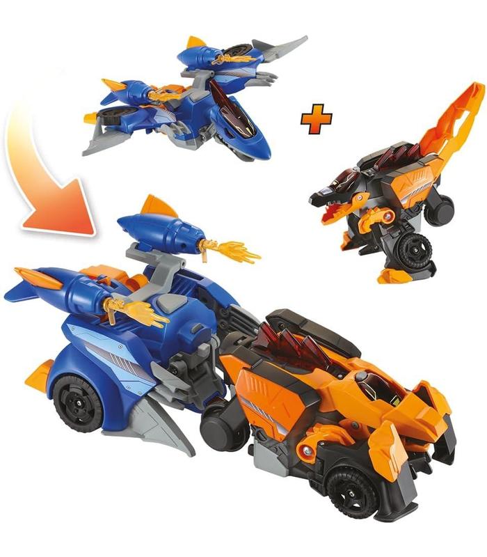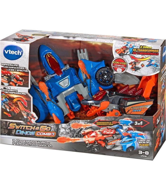 ¡SWITCH&GO DINOS 3 en 1 Espinosaurio-Pterodáctilo Dinocar combina dos DINOS y los transforma en un MEGAVEHÍCULO que lanza bolas de fuego! ¡Además si divides en dos al MEGAVEHÍCULO lo convertirás en un veloz coche de carreras y en un lanzador de bolas de fuego! ¡Vive la mayor y más divertida aventura de dinos con VTech!